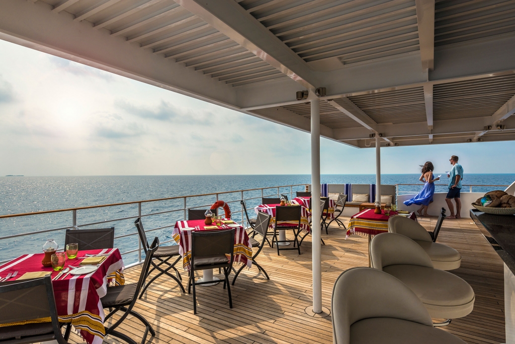The on-board dive centre gives you access to a wide variety of secluded hot spots, including exciting channel dives with sharks and rays, vibrant thilas, cleaning stations, wrecks and coral overhangs.