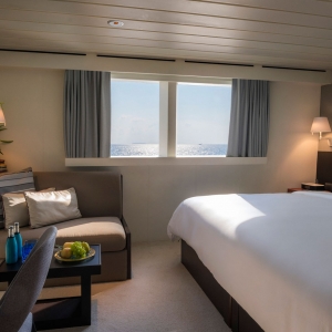 Curl up on the sofa with a drink from your private bar to enjoy a movie after an exciting day, or lie back on the bed and watch the stars twinkle over the ocean from your cabin’s large, port windows in these bright and airy State Rooms