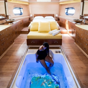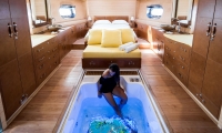 The ultra-indulgent yacht has a maximum occupancy of four adults and two children to provide the ultimate sense of exclusivity and privacy whilst offering intelligent luxury of the highest international standard. The boat features a spacious master suite with a glass-bottomed spa tub and an en-suite