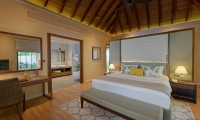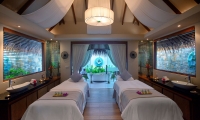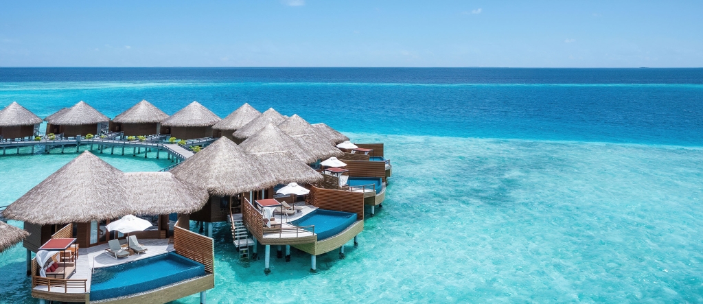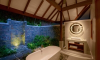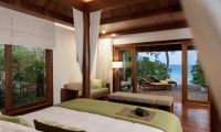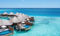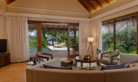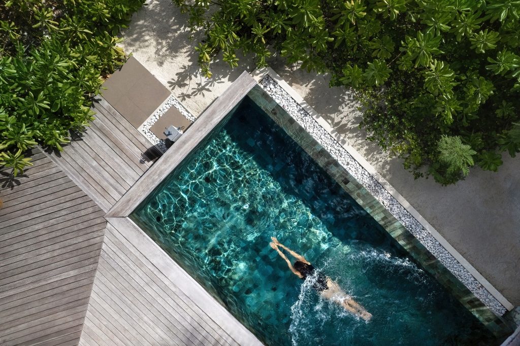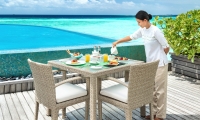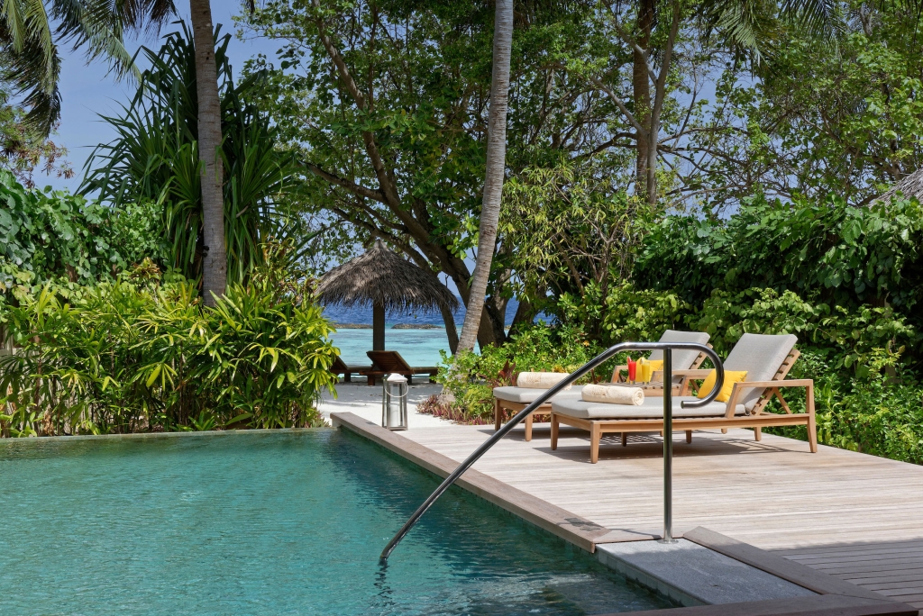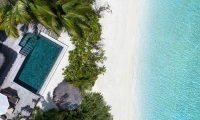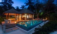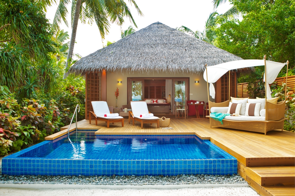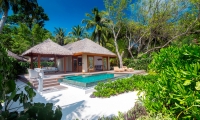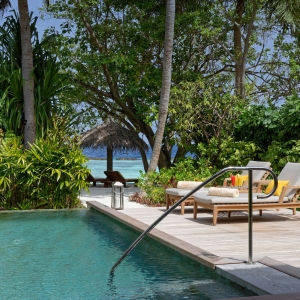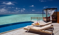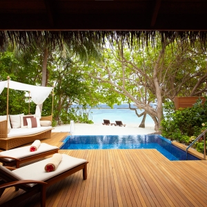A winding pathway through the lush foliage leads to these exclusive Suites, which feature wooden floors and high ceilings in a traditional Maldivian concept. At the foot of the king-size bed is an ottoman concealing a television screen while on one side there is a work desk and on the other, a cosy reading nook. In the adjoining lounge, there is a 55” television with access to movies and Internet and a sublimely cosy sofa for relaxation. Sliding glass doors open on to an expansive wooden deck ideal for sunbathing or private dining under the stars beside 19ft x 10ft swimming pool (which has a hot and cold Jacuzzi) adorned with fibre optic lights for a magical ambience in the evening.