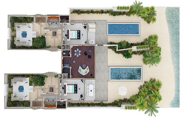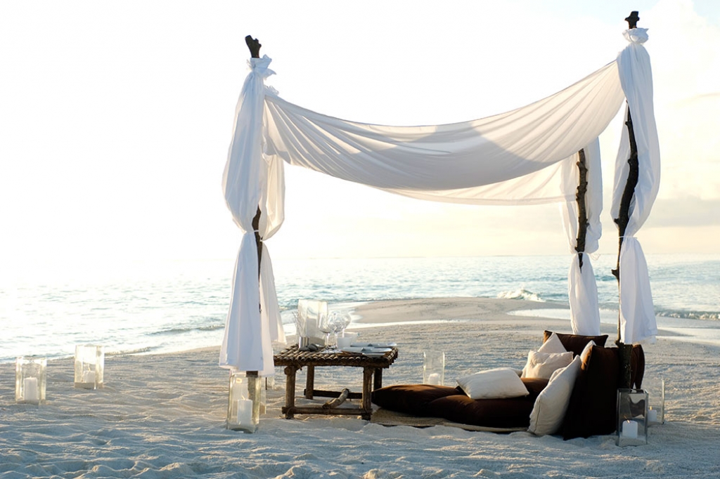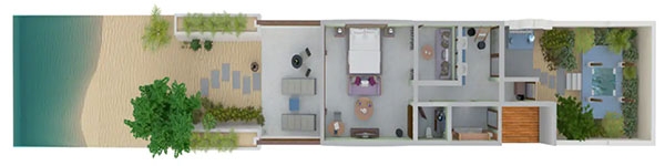 Located on Rangalifinolhu Island, step directly onto the beach. The extended space gives the option to create a second curtained-off bedroom. Your outdoor bath can be filled upon request for a luxurious bathing ritual.