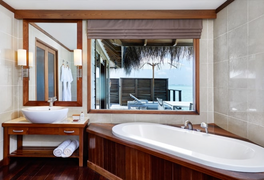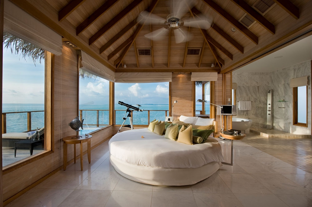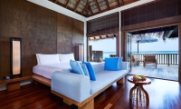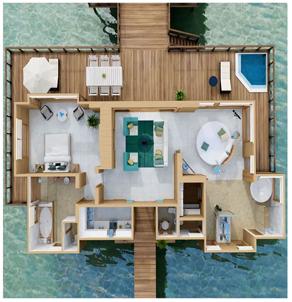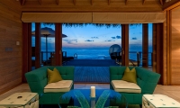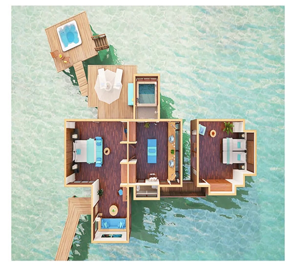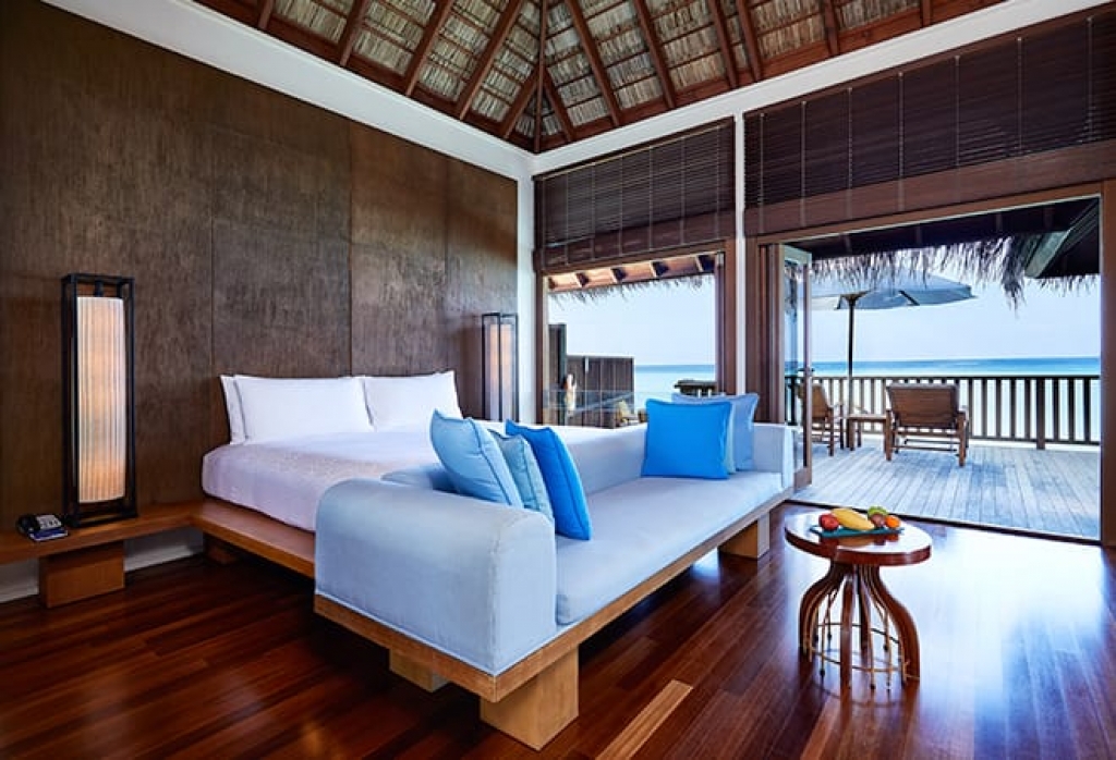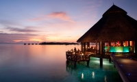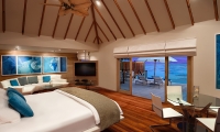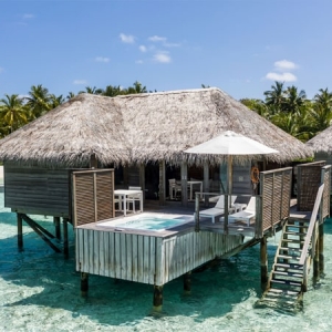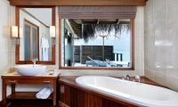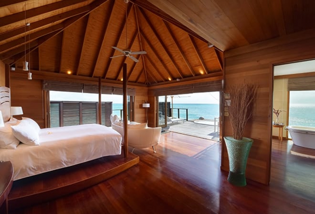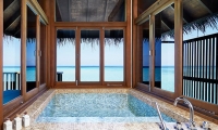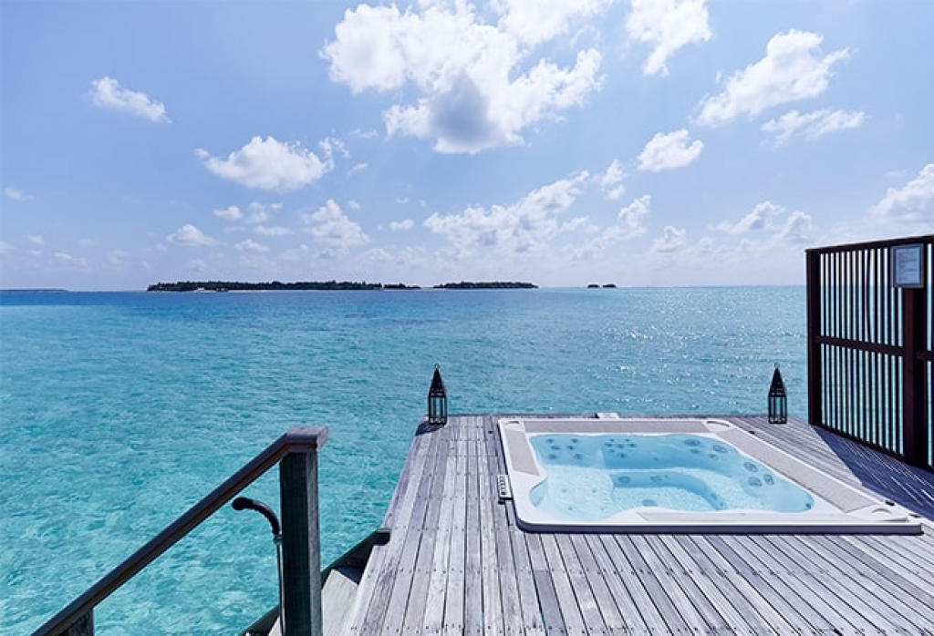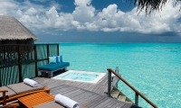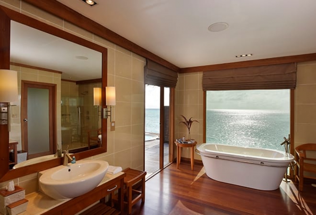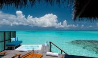 Set on stilts above the ocean, the premier villa offers a sundeck with a private infinity pool and sunset views. The luxury bathroom features an ocean-facing whirlpool tub.
