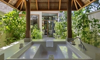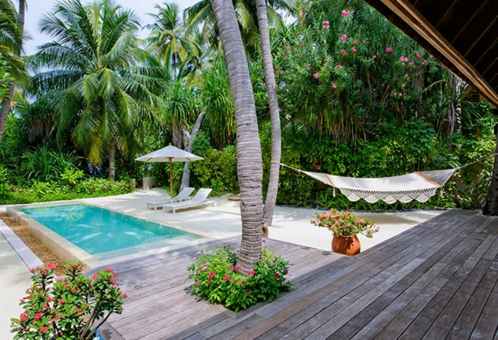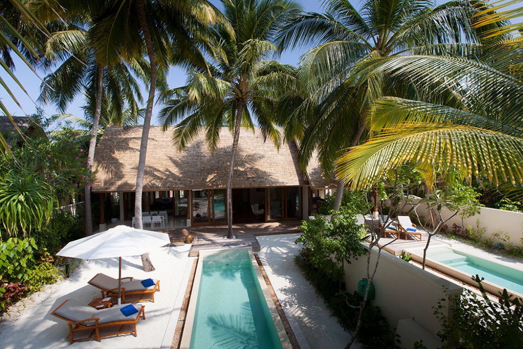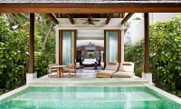 The deluxe beach villa, found on the livelier Rangalifinolhu Island, features a private garden, plunge-pool and an abundance of space illuminated by floor-to-ceiling windows. The outdoor bath can be filled upon request for a luxurious bathing ritual.