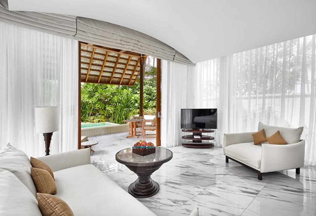 With sunset views, and a private deck with whirlpool and steps leading into the Indian Ocean, this spacious villa is the perfect hideaway. Benefits include a luxury bathroom with ocean-facing tub.