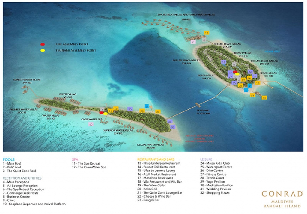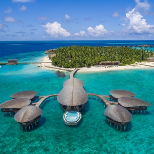 Conrad Maldives Rangali Island resort is spread across two private islands joined by a footbridge across a turquoise blue lagoon, among miles of white-sand beach surrounded by a vibrant coral reef. Rangali Island was the first resort to showcase water villas built on stilts above the lagoon and offer undersea dining at its restaurant Ithaa. THE MURAKA at Conrad Maldives Rangali Island. A unique three bedroom, two-level residence is an architectural marvel that sits above and below the surface of the Indian Ocean.