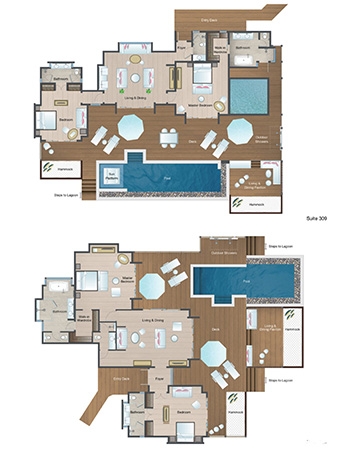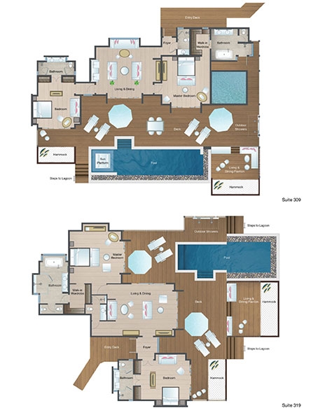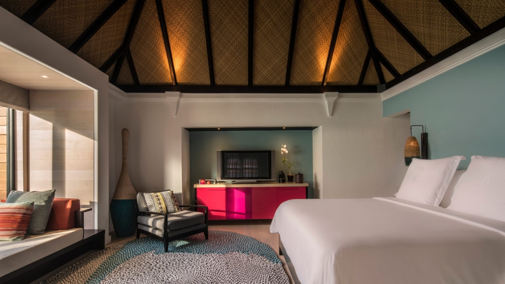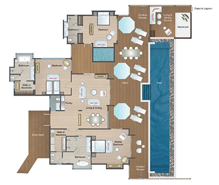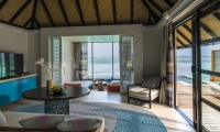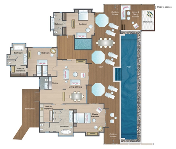 A palatial ocean-top retreat complete with dramatically extended deck, large infinity pool with sun platform, shaded lounge, al fresco showers and over-water hammocks. And that’s just the outside.