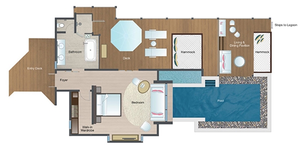 Dive from your bedroom straight into the infinity pool. Lounge on overwater hammocks. Bathe in sunset blues at the water’s edge living and dining pavilion. Descend the steps directly into the warm crystal lagoon, dotted with reef fish and corals.