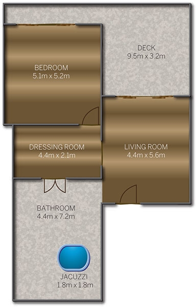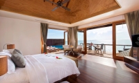 The Deluxe Water Villa with Pool is split into two sections, with the master bedroom on one side and the bathroom on the opposite site, separated by an entrance area. The large outside deck spans the whole length of the villa.