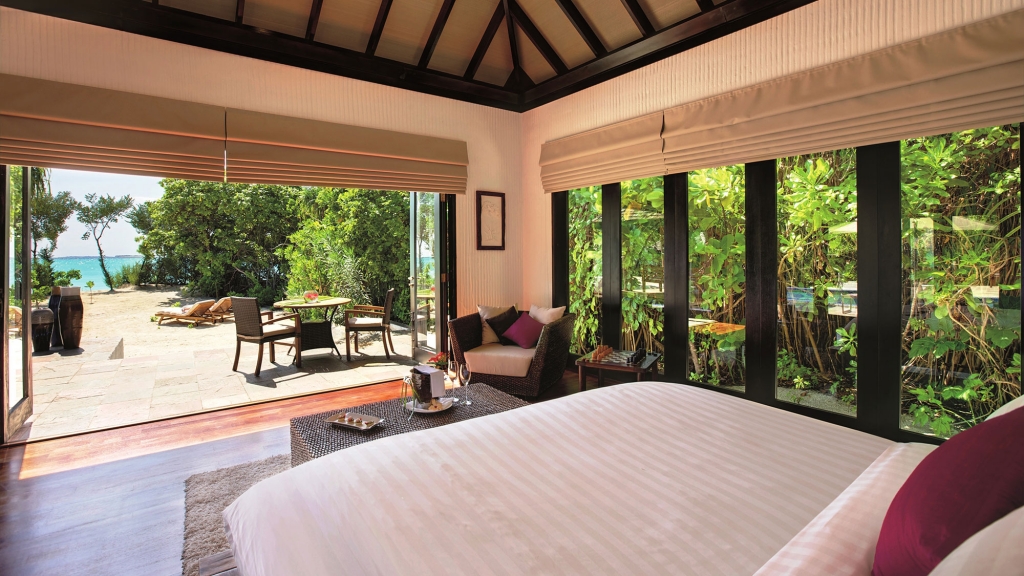Its private stretch of white sand beach is accessed directly from both the airy and spacious bedroom and living room.