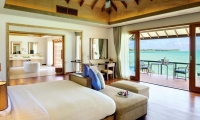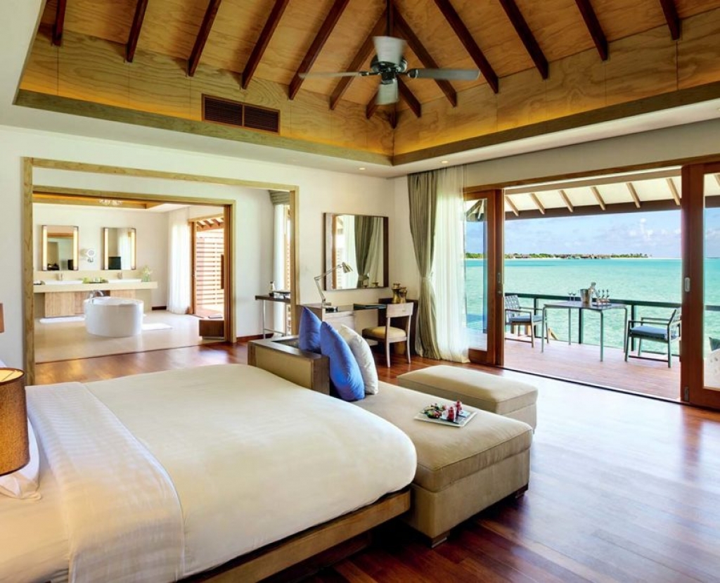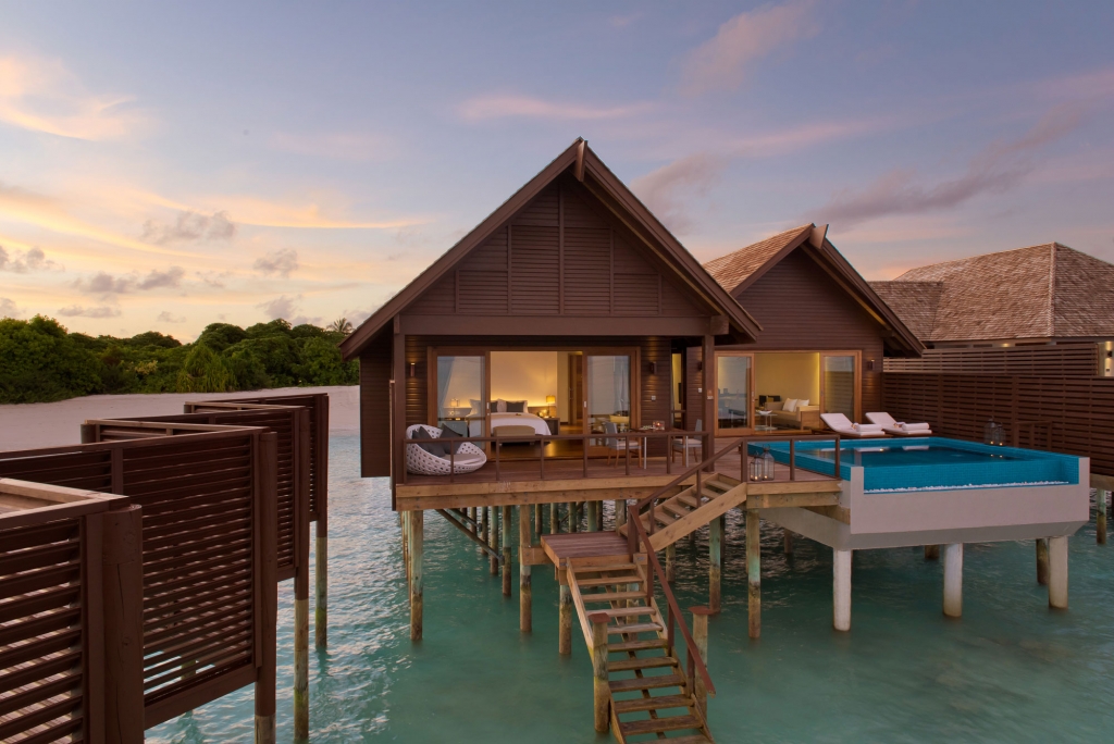 Built upon wooden stilts above the shimmering turquoise lagoon, and with floor to ceiling windows that make the most of the unforgettable panoramic Maldivian views.