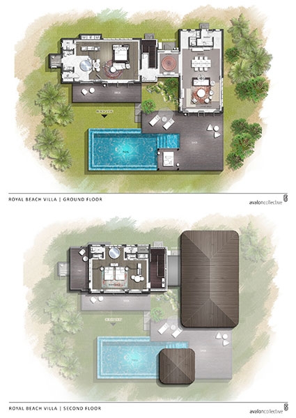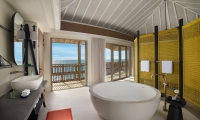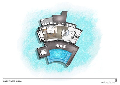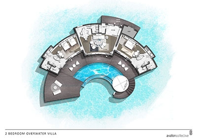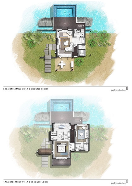 These 2 villas feature two separate bedrooms with one king bed and one sofa bed, two bathrooms, outdoor shower, spacious living area with powder room, sundeck and infinity plunge pool located over water and a terrace and balcony overlooking the lagoon.