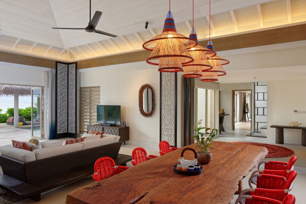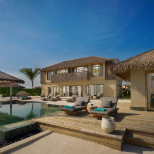 An oasis at the end of the lagoon, this double-storey residence offers a unique private retreat for families with children or multi generational families traveling together. The residence features a private master bedroom and bathroom in a separate building, two guest rooms on second floor with one king bed and two twin beds, ensuite bathrooms, open-plan living space, dining area, a fully equipped kitchen, expansive outdoor deck with open-air dining pavilion and infinity pool.