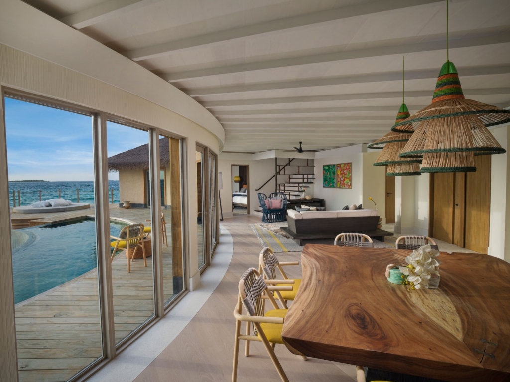 Located over crystal clear waters offering panoramic views of the Indian Ocean, this two-storey overwater residence is the perfect choice for families with older children or group of friends traveling together.