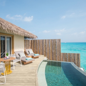 Take in sweeping views of the blue ocean, these 2 overwater villas open up to an expansive outdoor deck to soak up the sun and steps that lead directly into the sea; perfect for couples or friends traveling together.