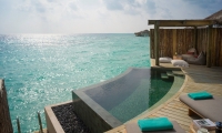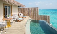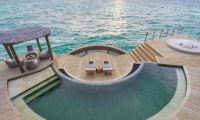 Split over two floors, the lagoon villas outdoor sundeck and infinity plunge pool are located over water with exquisite views of the ocean and direct access to the calm lagoon from the front of the villa.