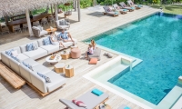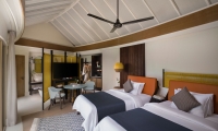 Perfect for couples travelling together or families with older children, these 2 west-facing family beachside villas feature two separate bedrooms with one king bed and one sofa bed, two bathrooms, outdoor shower, spacious living area with pantry and powder room, two sundecks and a private infinity pool.