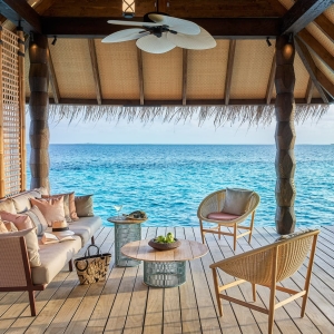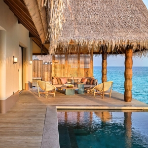 Raise a toast to superb panoramas from your bedroom and sundeck every evening at this spectacular overwater Maldives haven.