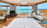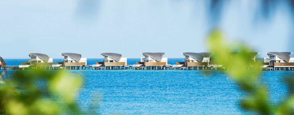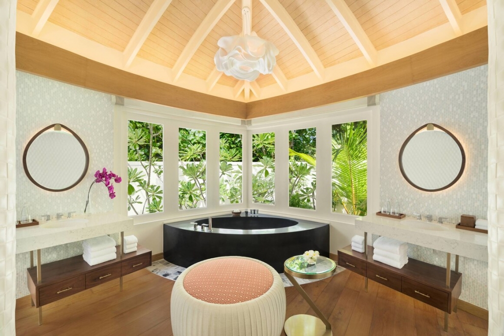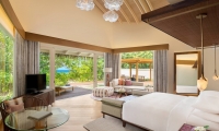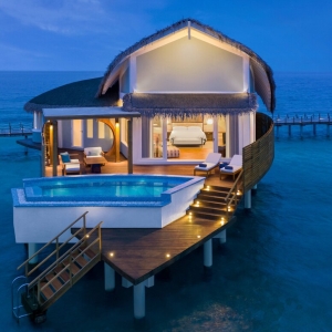 Spacious Overwater Pool Villas embrace the crystal blue waters and serenity of the Maldives in the modern design. Sliding doors from the bedroom open out onto the private decks creating an indoor/outdoor flow with Indian Ocean views and a bathroom equipped with a separate bathtub, indoor rain shower, and outdoor shower.
