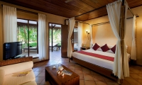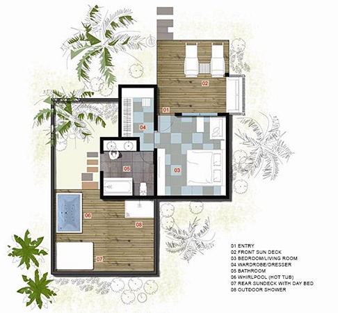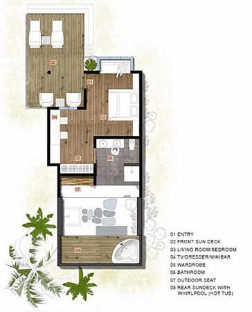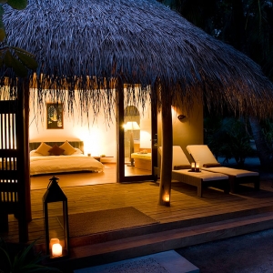 Sited amongst the natural gardens of the island, the wooden Beach Villas with Jacuzzi are dedicated to couples celebrating romance. The bedroom features king-sized four-poster bed and an inviting daybed, whilst the deck outside offers daybed and sunloungers for two. The bathroom is large and open air, and includes a tempting jacuzzi in the corner.