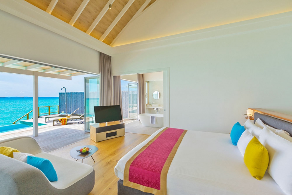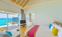 These magnificent villas are also built on stilts, close to the house reef with its colourful myriad of marine life. The villa features an airy bedroom with king bed and a spacious bathroom with twin vanities and rainfall shower. The villas also include an oversized two-tiered sundeck with your jacuzzi, sunloungers and sun umbrella. Enjoy panoramic views of the Indian Ocean with a bubbly drink in hand, and your favourite tunes playing the background.