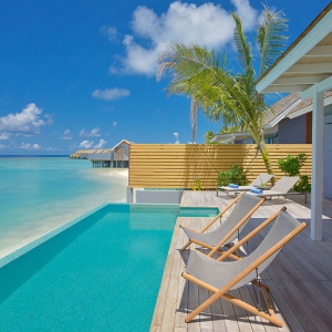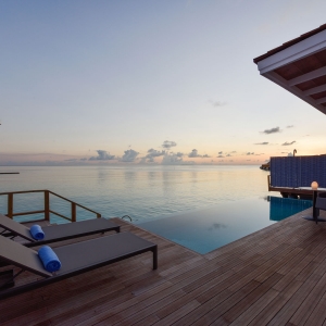 The Water Villas with Pool are located either in the crystal clear lagoon or facing the house reef, all featuring modern interiors similar to the Deluxe Water Villas. These villas also include a private pool (18sqm) overlooking the ocean.
