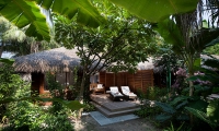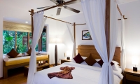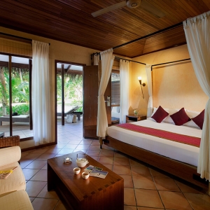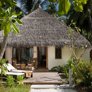 The Beach Villas are individual villas hidden within the abundant vegetation, yet only a few steps away from the beach. These villas face the lagoon side of the island and feature king-sized four-poster beds, wooden decks at the front with daybed and sunloungers. The Beach Villas also include semi-open air bathrooms with outdoor rainfall shower.