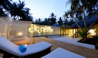 The Deluxe Beach Villas with Jacuzzi are located along the wide beaches in the middle of the island. Facing the turquoise lagoon, these villas boast oversized wooden decks with sunloungers, sun umbrella and daybed. The bedroom features a king-sized four-poster bed and a built-in sunlit daybed. The bathroom has a bath, twin vanities, shower, and a expansive outdoor area with a rainfall shower, sala bed for two, and an inviting jacuzzi on an elevated deck. The added luxury of an espresso machine with complimentary refill is included from this villa category upwards.