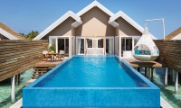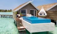 The luxurious Water Villas are suspended on stilts over the water, offering incredible views of the Indian Ocean and direct access to the lagoon. With a spacious bedroom and king sized bed plus sofa bed, an over sized bathroom with a large bath tub and separate shower, plus a day bed and sun beds on the sun deck, the Water Villas make for the perfect romantic Maldives getaway.