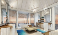 Designed for couples with unparalleled sunrise views over the Indian Ocean, the Temptation Pool Water Villa features 220 square meters of pure romance. A dedicated living space is framed by floor to ceiling windows infusing the villa with natural light. Outside, a spacious wooden deck terrace boasts a dining area and a cabana overlooking nothing less than a 14 meter infinity pool. Inside, sheer curtains adjacent to the marble-white Jacuzzi glass room freshen up the bedroom’s modern look surrounding a round shape master bed.