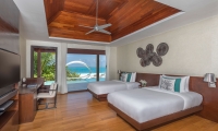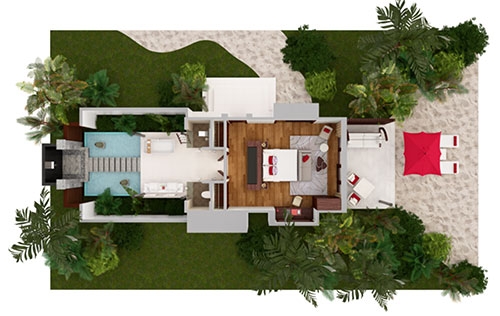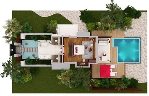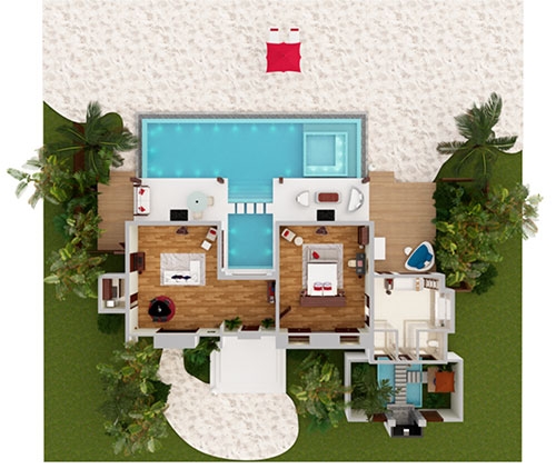 Two sumptuous bedrooms. A jungle-fringed deck. Lush. Lavish. Secluded. The perfect backdrop on which to design your days. Curl up with a book and green garden breezes, or venture into the ocean to snorkel and splash. Light up the night with a playful pool party, where the water comes alive with fibre optic lights and underwater speakers, or go low-key with surf-and-turf by starlight.