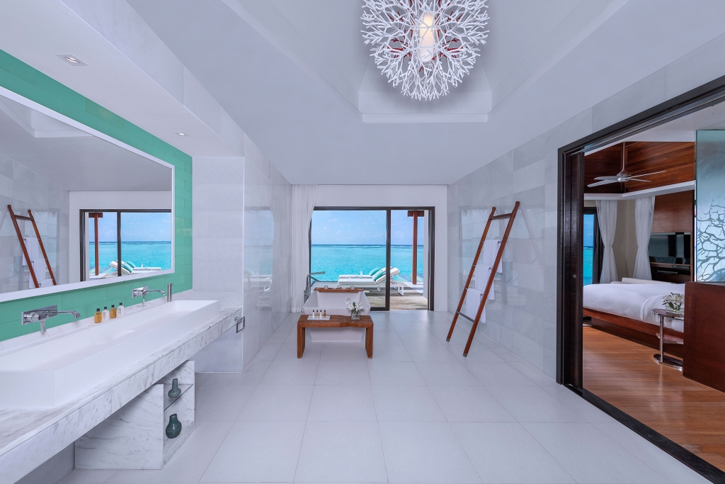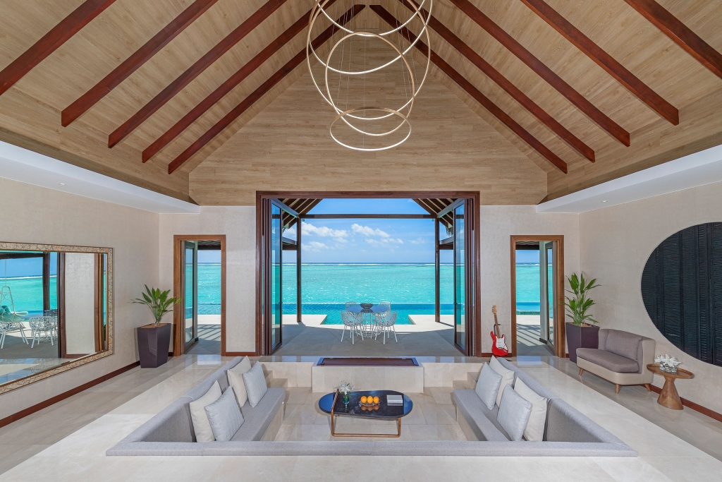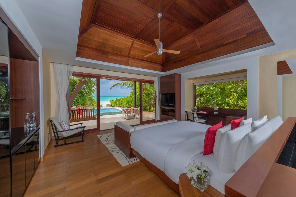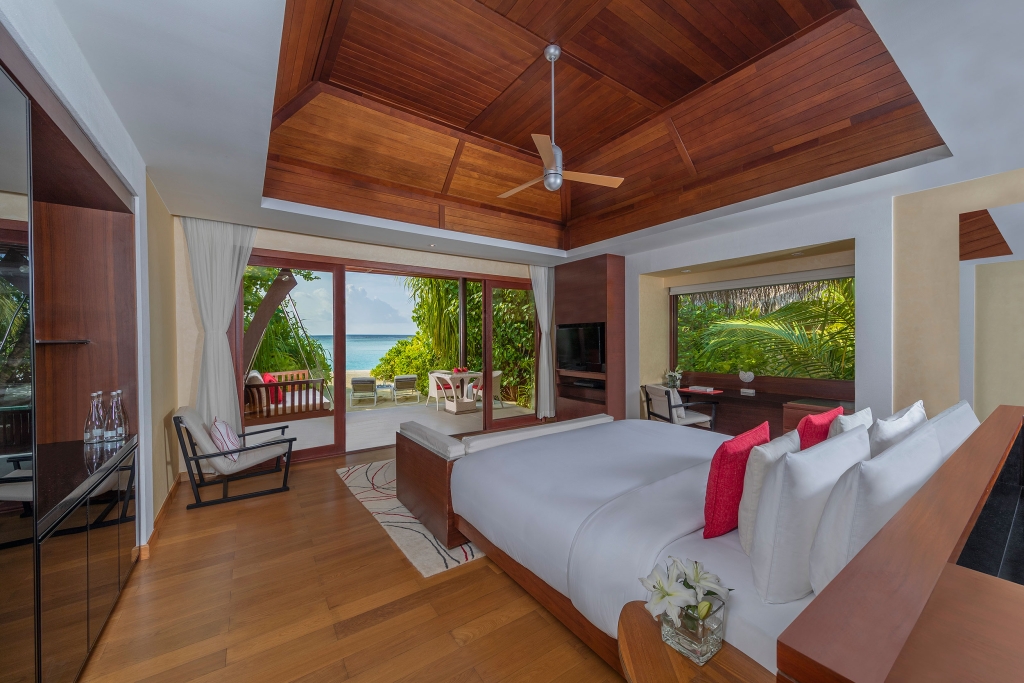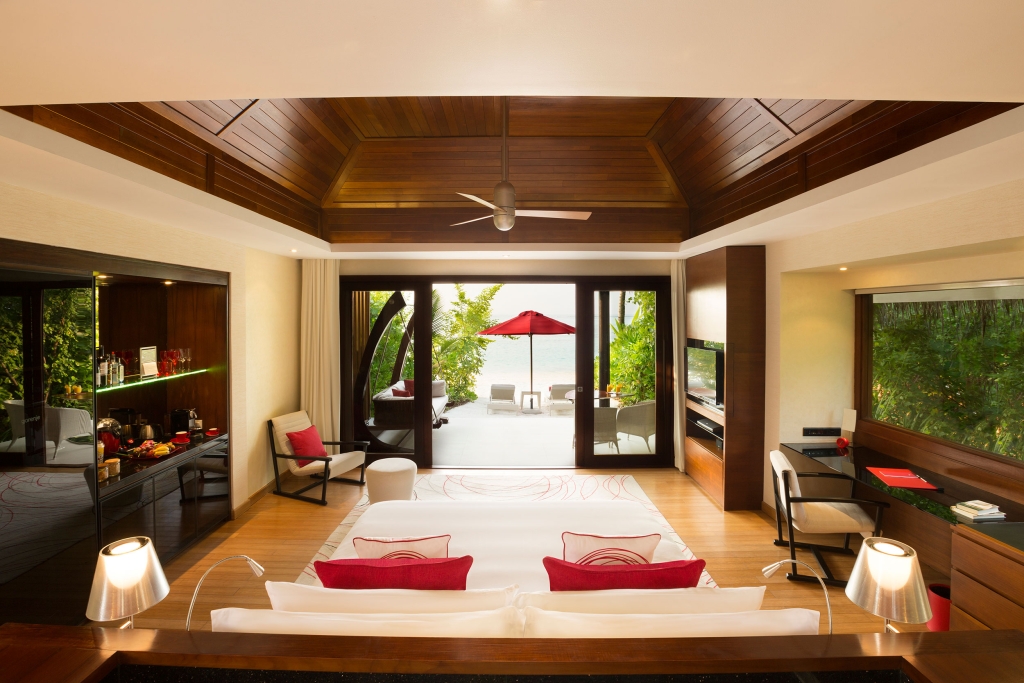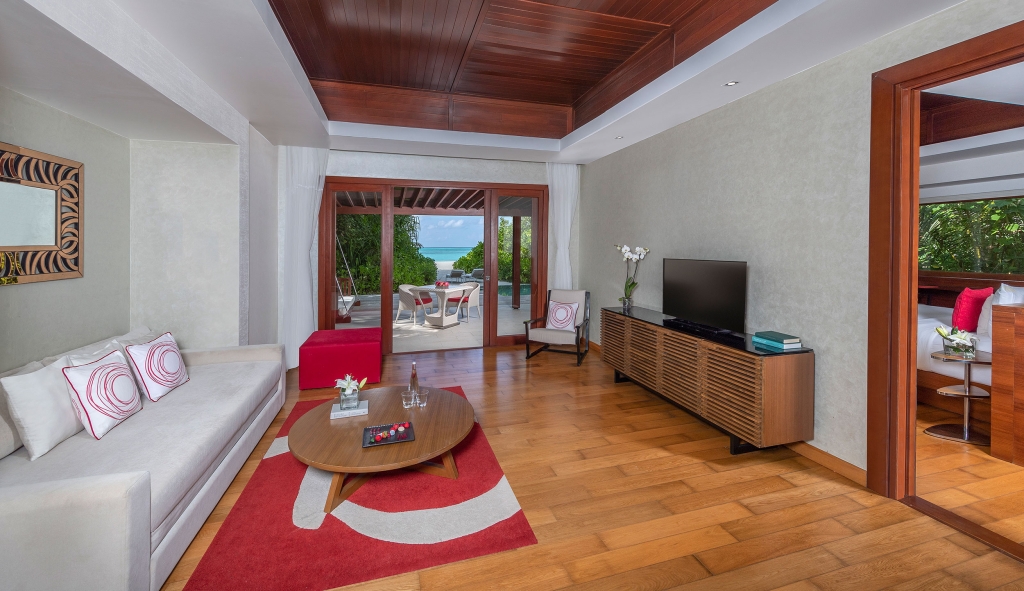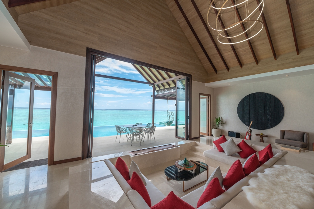 Inside, red accents explode amidst airy white interiors. High-tech toys and gourmet treats create an indoor playground, and the rain showers, your private waterfalls. For more, ring your personal Thakuru – your whim is our command.