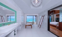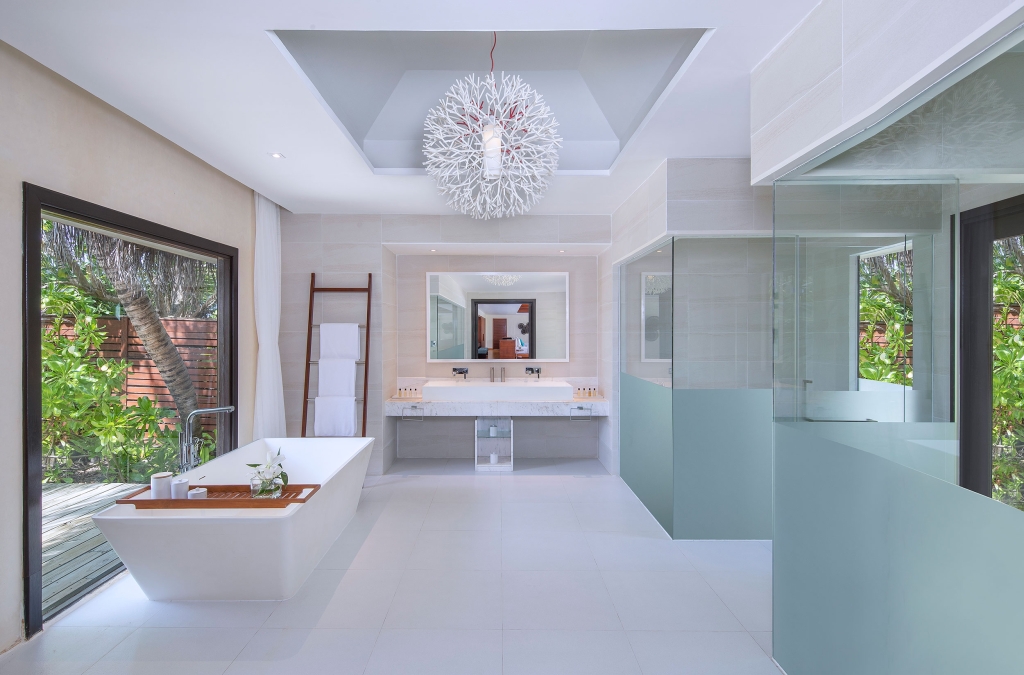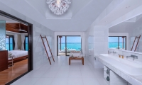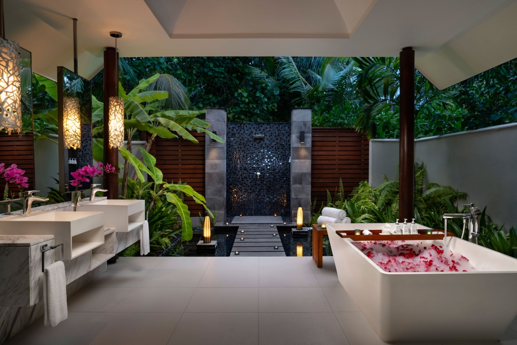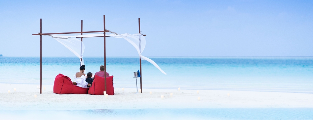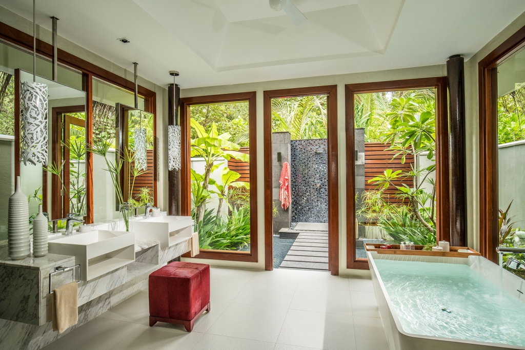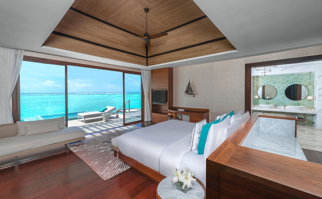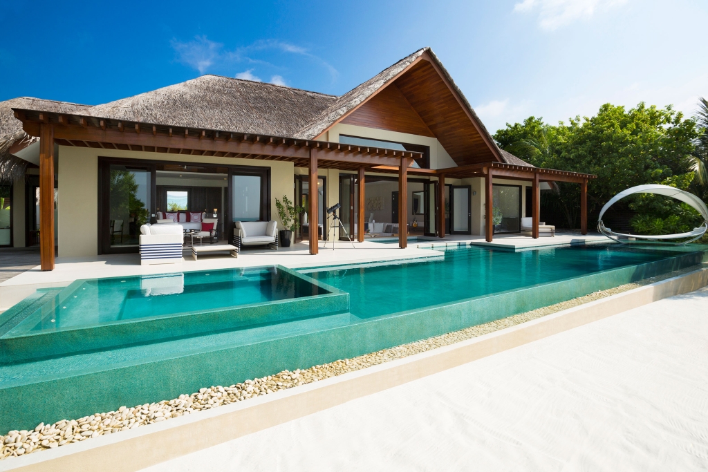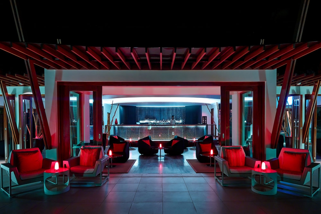 Inside, red accents explode amidst airy white interiors. High-tech toys and gourmet treats create an indoor playground, and the rain showers, your private waterfalls. For more, ring your personal Thakuru – your whim is our command.