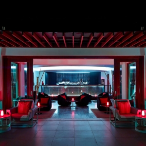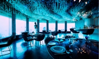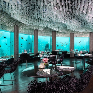 Reach Subsix by speedboat and descend a dramatic three-tier staircase. Italian abstract chandeliers illuminate the descent like shining coral. In the depths, hide away in the swooping curves of the clam-inspired bar, tucked into the soft anemone chairs beneath the soft waves of capiz shells draped from the ceiling.