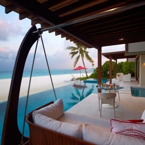 It’s peaceful privacy at this Maldives pool villa. Sway in your Dhoni-shaped swing and let your toes tease the water. Immerse yourself in a romantic, open-air rain shower. Linger over an al fresco dinner lit by the moon, or provide your own shine with the fibre optic lights of your private pool.