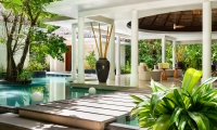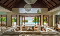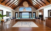 Inside, flow with the island breeze through spacious rooms —two bedrooms, sunken living room, dining room and cocktail bar—where cool hues offer respite from the sun’s rays. When night falls, get intimate. Flirt with the stars through your telescope, or envelop yourself in the pavilion’s sensual seclusion.