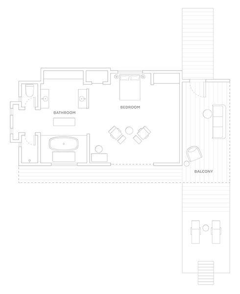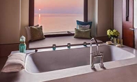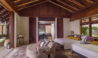 The large bedroom offers a king-size bed and stunning ocean views from the floor-to-ceiling windows, and a spacious, sun-drenched en suite with soaking tub. Through the wide villa doors, the airy, spacious layout invites long and lazy days lounging between your living room and sun-lit terrace.