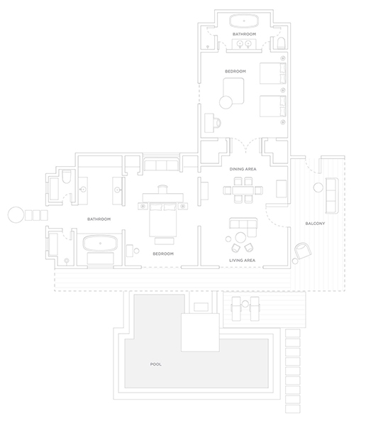Three bedrooms across two separate villas, multiple living and dining spaces and oversized bathrooms give you and your companions plenty of room to stretch out. One villa hosts two bedrooms with a king-size bed, and two queen-size beds, respectively. The second villa is a private haven with a king-size master bedroom.