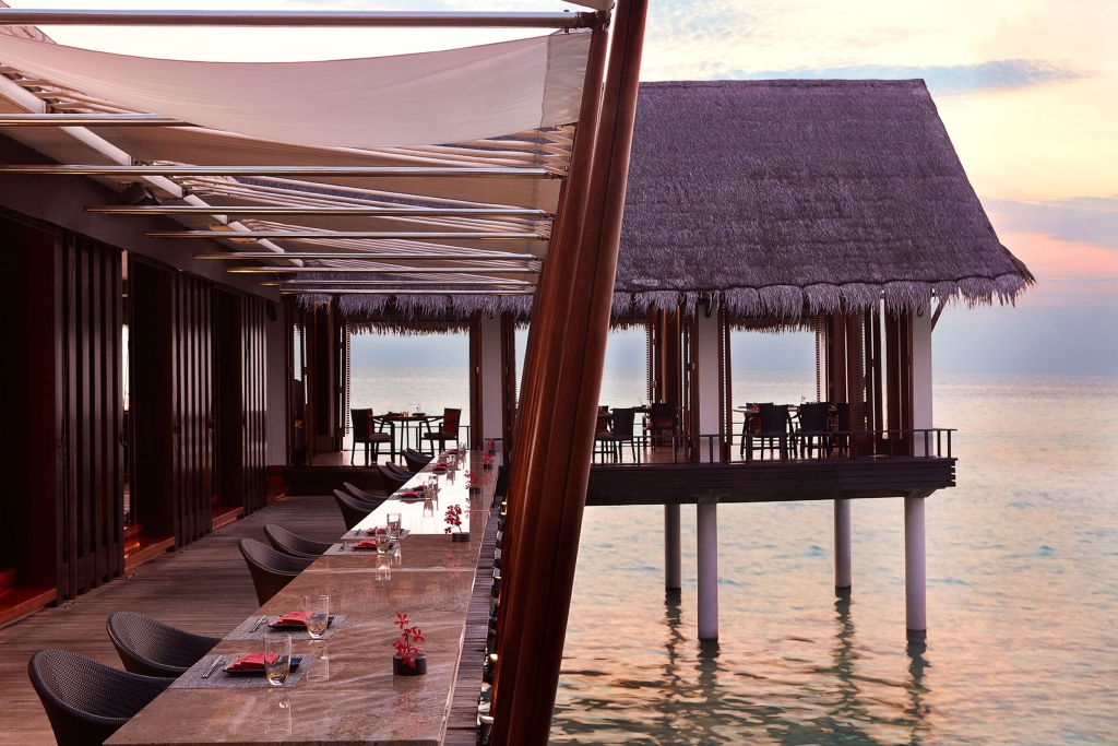 Rising from the ocean, Reethi is breezy and bright by day, serving an array of breakfast dishes on our spectacular over-water veranda. By night, it transforms into a dramatic food theatre. Here, the floor is arranged into three distinct dining experiences: Earth – for fine French fare, Fire – which whips up the full spectrum of Asian flavours with vibrant Indian, Maldivian, Sri Lankan, Chinese and Thai specialities, and Aqua – the section for seafood lovers, delivering authentic Italian flavours.