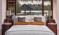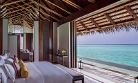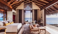 Inside these stunning Water Villas in the Maldives, you'll find an airy bedroom with a king-size bed and floor-to-ceiling windows revealing immersive water-to-sky views. A separate living space for lounging and dining meets a wide-windowed bathroom, the elegant oversized tub offering its own breathtaking view of the tranquil waters beyond.