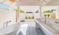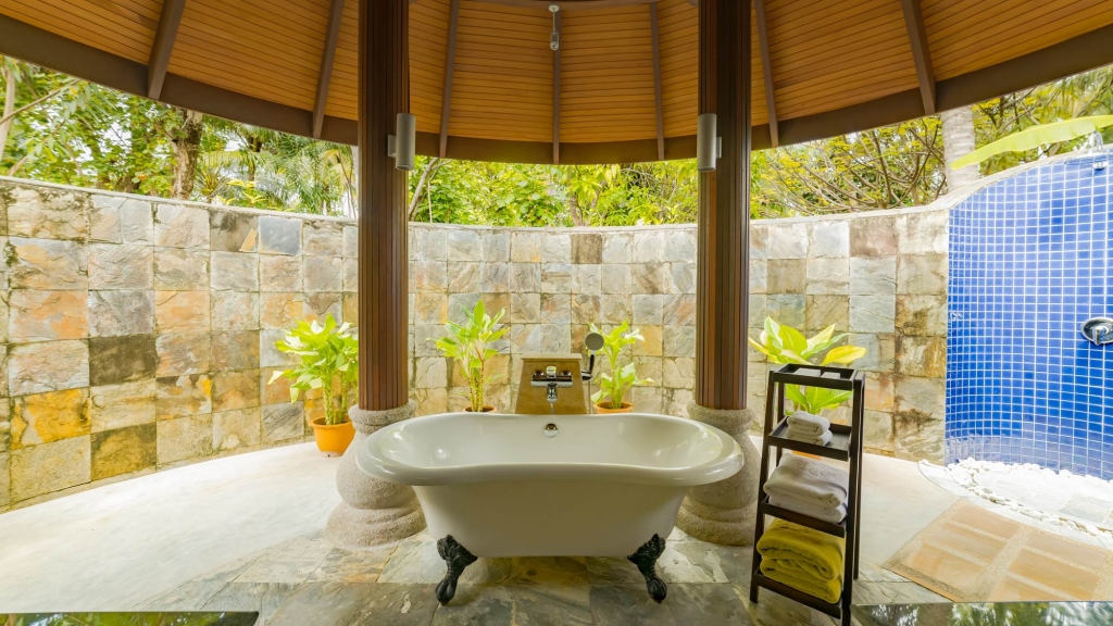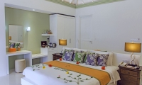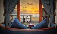 Set right on the beach, these villas boast private pools and expansive outdoor lounges with a day sofa, dining table and sun loungers. Inside, a king size bedroom with a large alcoved daybed leads to an open-air bathroom with a spectacular rain shower.