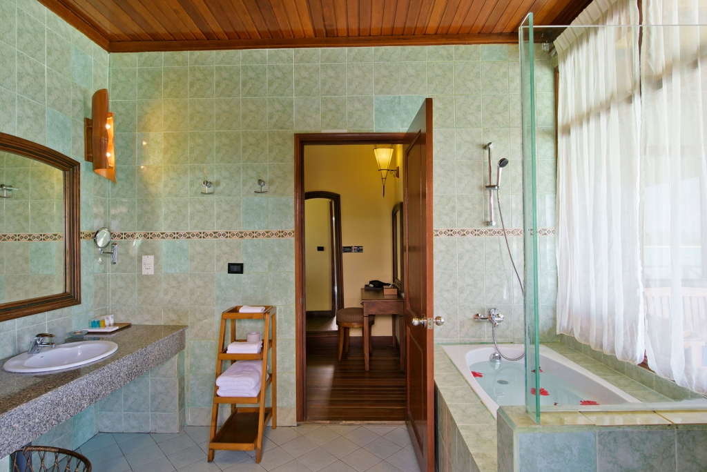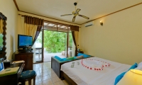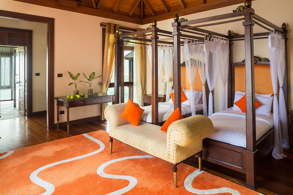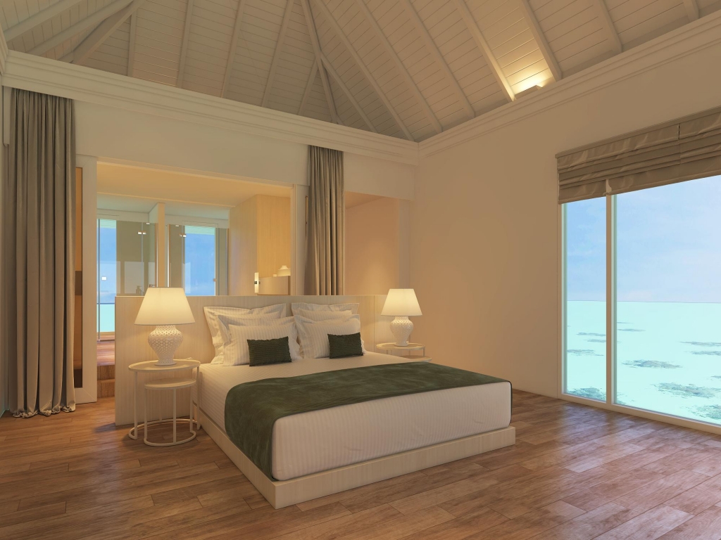 These standard accommodations are anything but standard. Doors open onto a spacious beachfront terrace or panoramic balcony, with the warm waters of the lagoon just a few steps away. Inside, a generously proportioned king size bedroom leads to a bathroom, with walk-in shower and dressing area.
