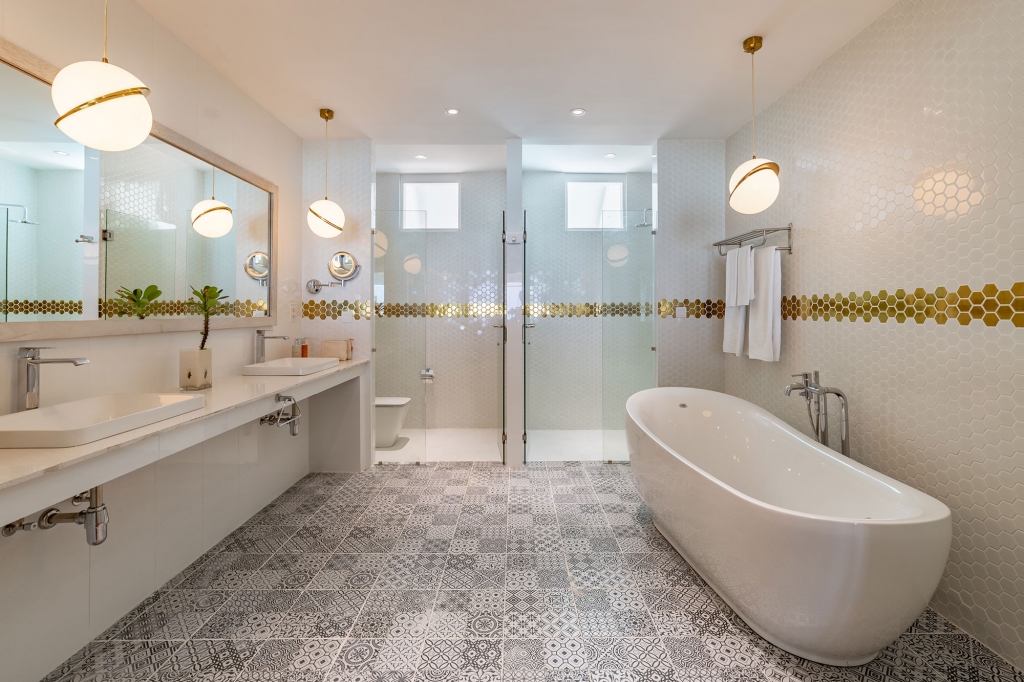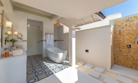 King size bedrooms feature clean white lines with bold splashes of colour, plus an alcoved daybed that’s perfect for sinking into with a good book. Outdoor bathrooms are generously proportioned, and on the beachfront terrace you’ll find a dining area, daybed and sun loungers.