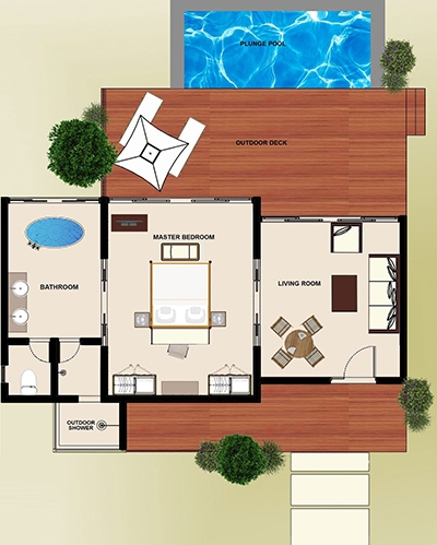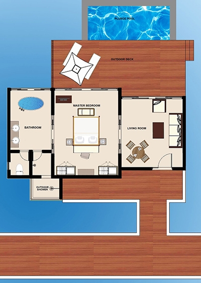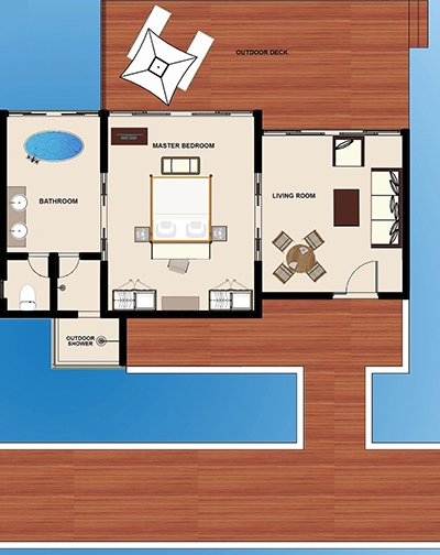 Tucked away in one of the most private locations of the resort, indulge in the luxury of space within a Deluxe Water Pool Villa, heightened by the spectacular feeling of airy openness that enlivens all your senses. Surrender to the pleasure of relaxation within the oversized living room designed to immerse you in absolute comfort while reading or unwinding on the sofa, or contemplating the glorious view