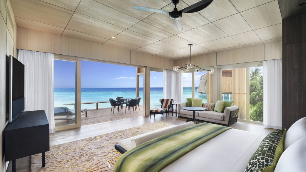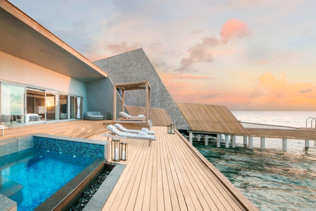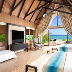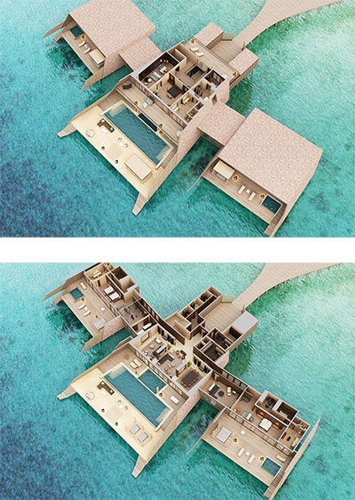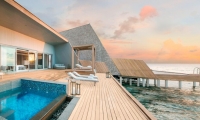 Epitomizing grandeur, each Two-Bedroom Family Beach Villa and Two-Bedroom Family Overwater Villa boasts a winsome furnished terrace with storied ocean views and private pool.