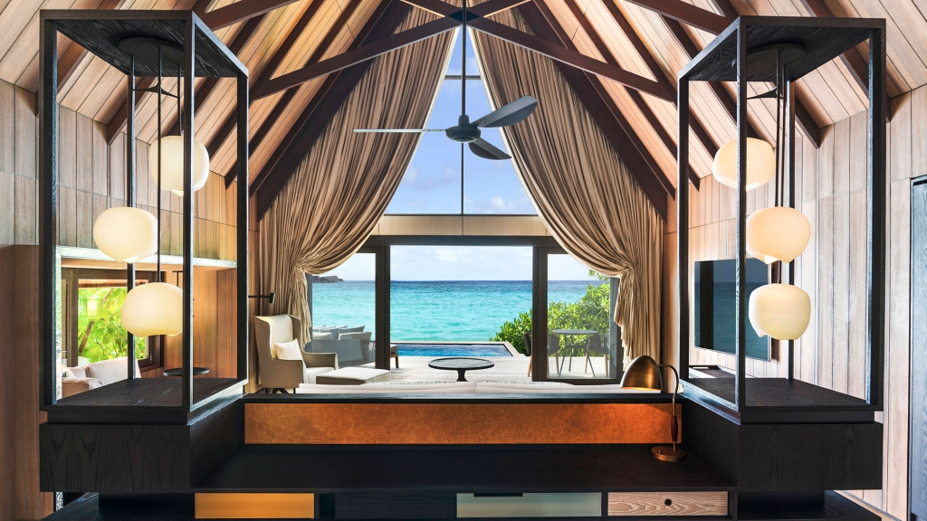 Overlooking Vommuli’s white-sand beaches and the ocean’s azure waves, the ample wooden terrace is immaculately furnished with a plush daybed and sun loungers. A 16-square-meter private plunge pool invites guests to enjoy a refreshing dip. Natural light through floor-to-ceiling glass doors brightens the indoor space. Mahogany ceilings and floors harmonize with a winsome palette of cream, sand, turquoise, and gold.