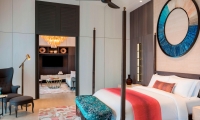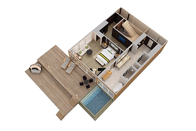 Breezy and inviting, the terrace boasts a 16-square-meter private plunge pool framed by sun loungers and a plush daybed. A wooden gazebo provides a romantic sitting area while four overwater hammocks invite guests to soak up the tropical sun. Visible through towering sliding glass doors, the terrace adjoins a flawless living room elevated by rich mahogany floors. The perfect setting for an intimate meal, the open floor plan features a refined dining table that seats four. State-of-the-art technology includes a Bang & Olufsen 55-inch LCD television and sound system as well as iPad room controls. An elegant writing desk enhanced with multimedia connectivity provides a comfortable workspace. A guest powder room is conveniently located off the living room.