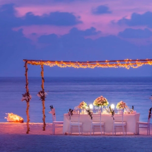 For an opulent beachside experience with elevated privacy, this luxurious dining setting is arranged within a private hut adorned with fragrant, tropical florals, dreamy candlelight and festive lanterns. Before twilight arrives, bask in the magic as the sun sets below the ocean’s horizon, a picturesque background paired with one of three premium Asian and European barbecue style menus.