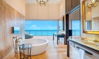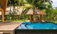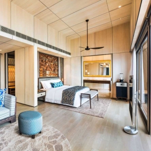 Opening onto the sparkling waters of the villa’s private pool and verdant garden, the terrace is beautifully appointed with a plush daybed and sun loungers. An inviting wooden gazebo with a bench swing offers a romantic sitting area. Meanwhile, floor-to-ceiling glass doors suffuse the indoor space with natural light as lofty wood ceilings accentuate the suite’s airy ambiance. Adorned with contemporary lighting features, the suite features rich mahogany floors balancing an island-inspired palette of cream, sand, turquoise, and gold.
