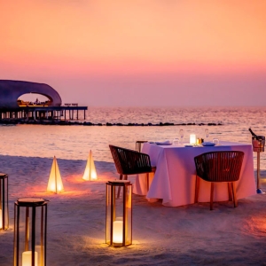 For a truly majestic private beach dining experience, this Arabian Bedouin style setting is arranged with an exotic carpet, bedouin cushions, low tables and enchanting Arabic lanterns. Surrounded by the soothing sounds of paradise, enjoy Arabic style cuisine with live barbecue menus that feature hot & cold Arabic Mezes with meats and/or seafood, and dessert to finish.