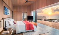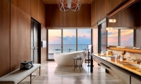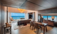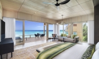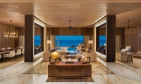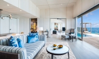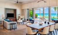 Commanding riveting vistas of the Indian Ocean, the ground-floor terrace boasts a 67-square-meter private swimming pool framed by comfortable sun loungers and a plush daybed. Sliding-glass doors open onto the terrace from the impeccably designed living room, where a plush sofa and armchair invite guests to partake in the premier views. State-of-the-art technology includes a Bang & Olufsen 55-inch LCD television and sound system as well as iPad room controls. Meanwhile, a splendid breakfast bar serviced by a fully-stocked show kitchen promises memorable meals for six.